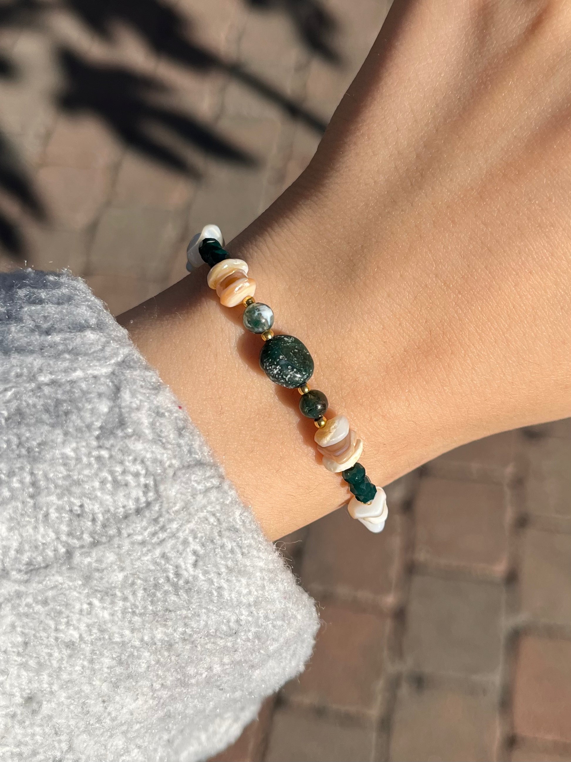 Schönes, dunkelgrünes Armband mit Achatsteinen und hellen Akzenten aus Muschel ˚˖𓍢ִ໋`🌿:✧˚.⋆🍃