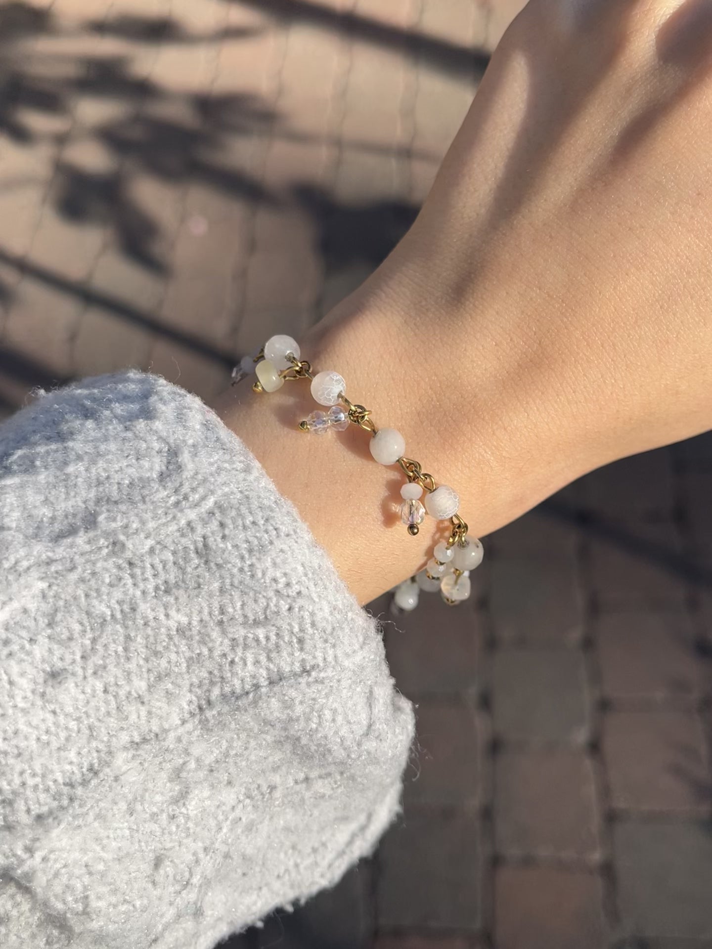 Ein Clutter Armband mit drei verschiedenen Halbedelsteinen im weißen Farbschema und vielen Anhängern .*・。゚ 🤍💫